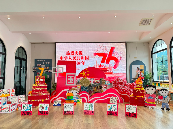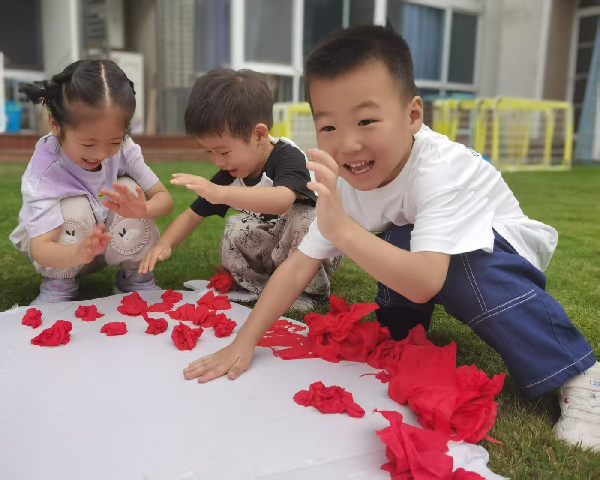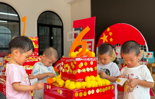 “要给祖国妈妈过生日啦!”孩子们围着大大的“蛋糕””和“中国地图”手工板忙不停。有的用彩泥捏“奶油”、撕纸片贴装饰,给“蛋糕”叠了一层又一层;有的揉红色皱纸团成小花球,轻轻贴在“中国地图”上,不一会儿,“大中国”就变成了红色的小花海。