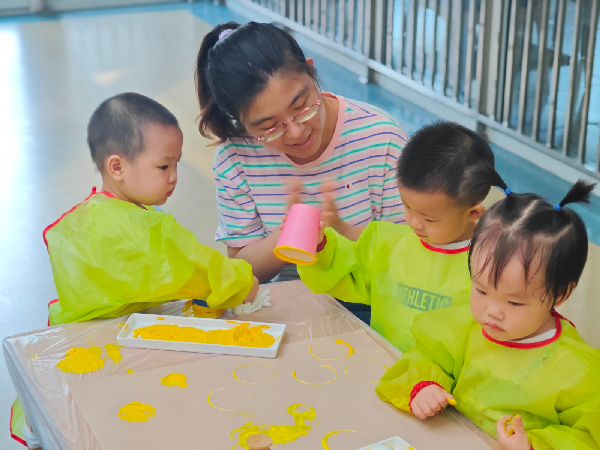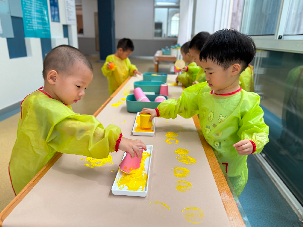 中秋佳节月圆圆,瞧,我们托小班的小宝贝们,有的攥着海绵块蘸满黄色颜料,在牛皮纸上用力地按出一个个圆圆的“月亮”;还有的用瓶盖、瓶底、圆形积木也变出了各种各样的“月亮”,有大大的,有小小的,挂在空中,照亮澜湾。