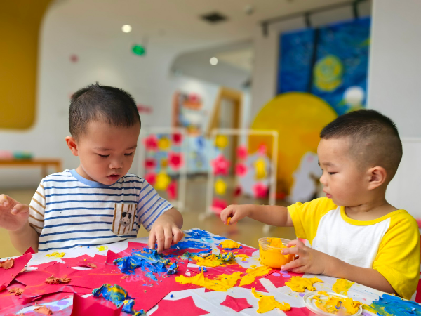 “我要把星星画亮!”“我用彩泥捏星星!”孩子们围在桌子旁,你一言我一语地讨论着。有的捏起黄色彩泥,搓成小圆圈,一点一点贴在五角星轮廓上,让“星星”变立体;有的用彩笔在五角星边缘画歪歪扭扭的波浪线,说这是 “星星的光”。每个区域的星星都被打扮得不一样,闪闪亮亮真好看。