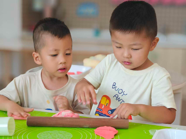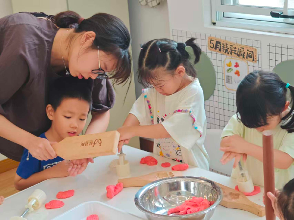 揉一揉、搓一搓、团一团,托小班宝贝的 “小月饼”开始制作啦!有的拿起擀面杖把面团擀平,有的用小磨具压出花纹,红、黄、绿、蓝的 “月饼” 一个个摆在盘子里。虽然模样小小的,但都是宝贝们亲手做的,闻一闻、看一看,好像连中秋都变甜了。