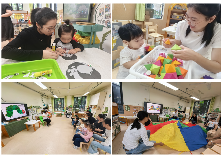 今天气温略低还伴着些许小雨,但一点也不影响宝宝们来园参加早教活动。本次活动开设了多个游戏区,有美工区的“贴五官”和益智区的“积木搭搭乐”,还有“好玩的娃娃家”、“宝宝爱看书”等游戏。最后,邱邱老师组织开展小集体活动《毛毛虫》,通过有趣的儿歌、游戏、音乐等方式激发宝宝开口说话的兴趣,从而促进宝宝语言能力的发展。