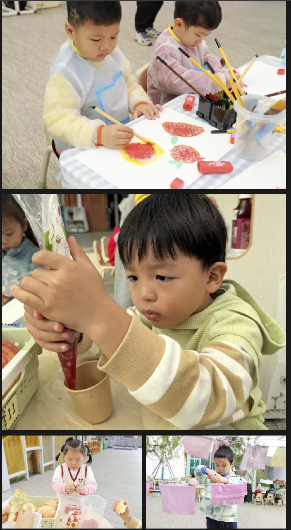 红红的石榴,像宝石一样!月亮4班一起敲开了这个“红色大宝箱”。里面住着好多好多晶莹的“宝石娃娃”,尝一口,酸酸甜甜。孩子们榨石榴汁、用石榴染布,把秋天的颜色和味道都留了下来!