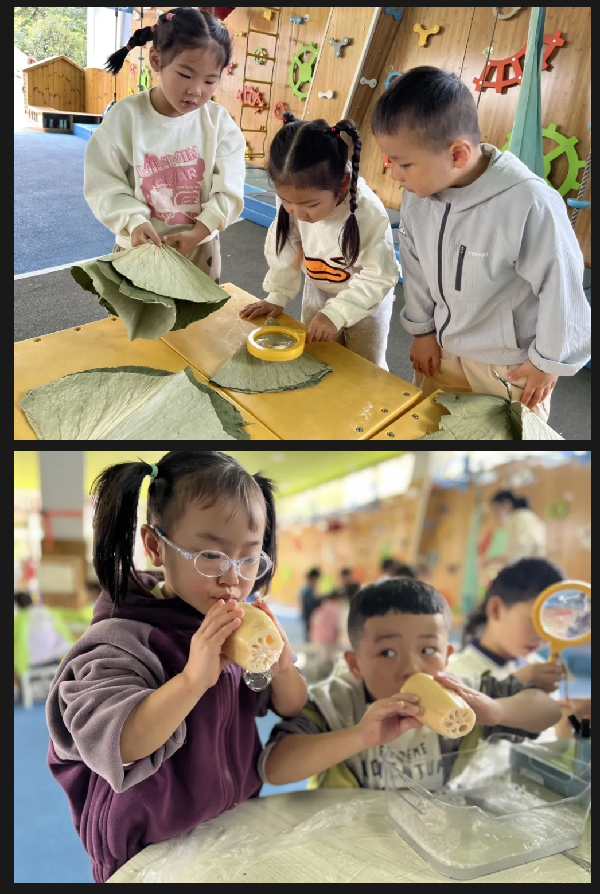 月亮3班的小朋友们发现荷叶是“滚珠大师”,水珠在上面滑滑梯;莲藕身体里有很多小洞洞,像个大眼睛。我们还做藕粉、用藕画画,原来荷花、荷叶和莲藕是一家人!