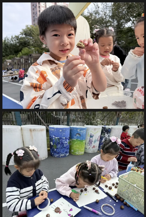 “哎呦,这个果子像个小刺猬!”月亮1班发现了一种叫“板栗”的宝贝!它外面毛毛的,里面光溜溜。孩子们看看它、摸摸它,还把它变成了好吃的和好玩的!