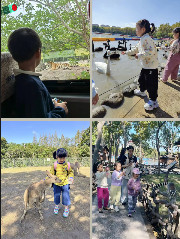 到达野生动物园后,小玩童们来到海狮表演馆,近距离观看聪明海狮们的精彩表演,引得孩子们阵阵欢呼。接着,大家又迫不及待地走进步行区,小玩童们认真记录着灵长类动物、鸟类等各类动物的特征与行为,用眼睛发现、用小手记录、用心灵感受野生动物的神奇魅力。最后,坐车来到猛兽区,当看到威风凛凛的狮子、老虎在领地内踱步,孩子们既兴奋又有些害怕,紧紧拉着爸爸妈妈的手。