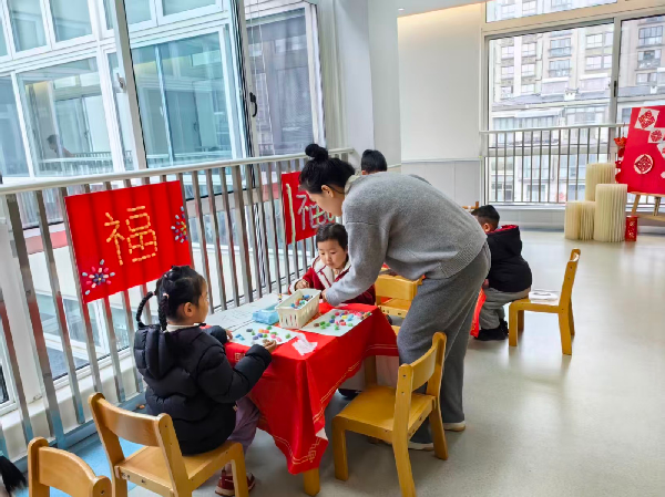 皱纸、糖纸、玉米粒、包装纸……各种材料被扭成图形,装饰在福字周围。“老师,我画了两个福,一个送给妈妈,一个送给奶奶!”……
