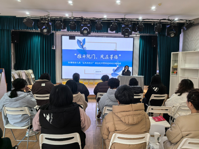 2026年3月18日,红珊瑚幼儿园开展“追风的院子”理念发布暨师德师风专题培训,全体教师齐聚底楼多功能厅参与,厉建芳园长主持本次活动。