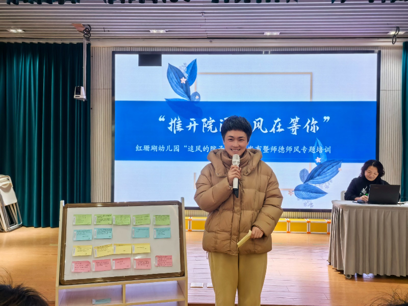 活动中,厉园长从院子的根、追风的翼、风的方向三大篇章,为老师们系统解读“追风的院子”核心理念,清晰阐释了院子的三重根脉与追风的多元内涵,也赋予了风四季信使、文化载体、成长隐喻的深层意义,同时确定以“四季共玩节”作为理念落地的核心载体。随后的互动环节里,老师们纷纷书写并分享了自己心中的“追风的院子”,一个个自由温暖、兼具自然野趣与生活烟火的教育图景被勾勒出来,也传递出大家共筑美好教育环境的热切期待。