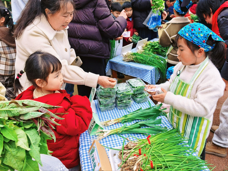 大班组将收获与实践结合,幼儿走进种植区,采摘菠菜、芹菜、萝卜、芋艿等蔬菜,认真清洗包装,锻炼动手能力,了解植物生长周期 。“乐乐小菜市”热闹开市,孩子们化身“小小售卖员”,热情推销种植蔬菜,家长踊跃参与,劳动成果传递至家庭,餐桌上的美食尽显温暖。