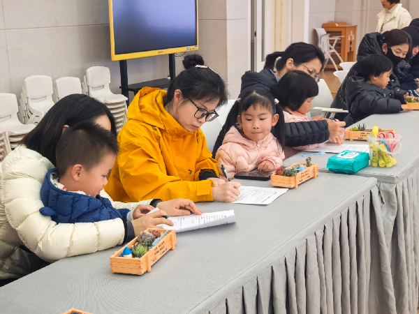 在主持人沈老师的带领下,每组家庭拿起小铲子、花盆和多肉幼苗,从认识土壤、栽种多肉,到铺石覆土、蓝沙造河,再到添置摆件,每一步都蕴含着生动的生态小知识。