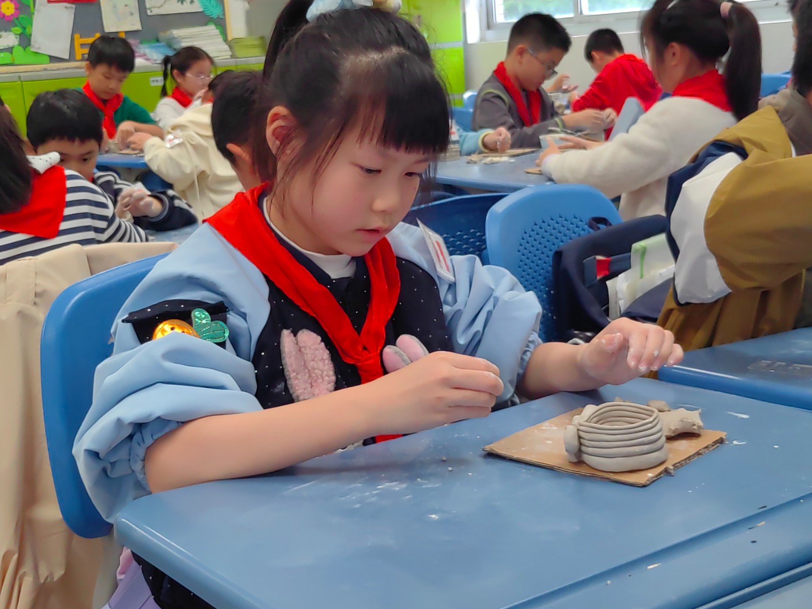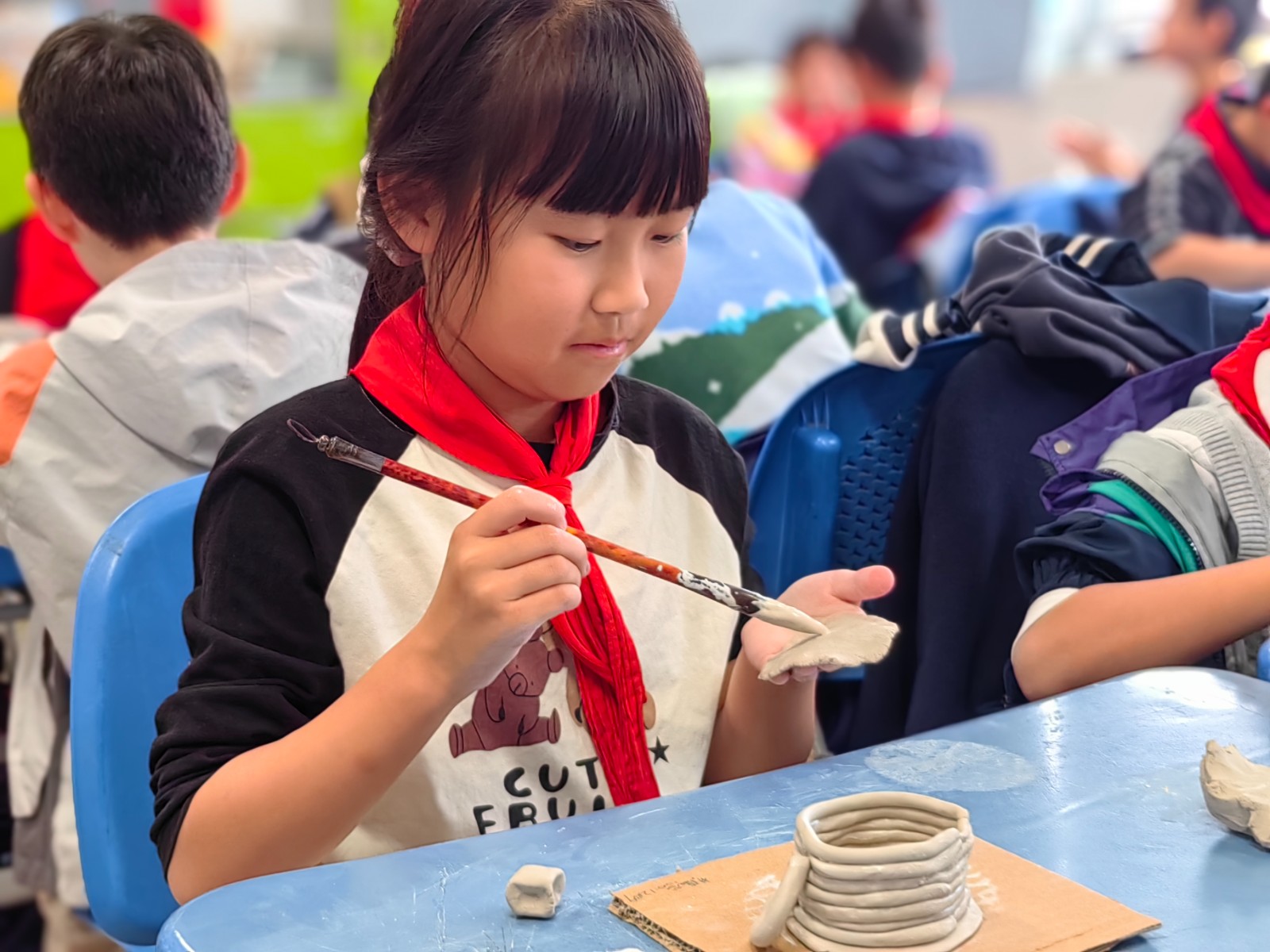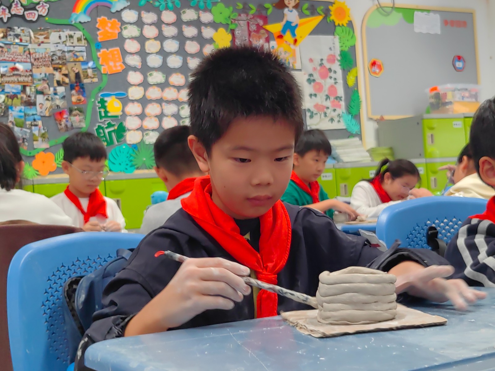 户外研学活动结束后,队员们重返课堂,亲身体验泥塑陶杯的制作过程。首先由专业老师向大家讲解并演示陶杯的制作方法。随后,学生们纷纷化身“小小陶匠”,在老师的指导下用陶泥亲手制作属于自己的陶杯。揉泥、塑形、装饰……每一道工序都凝聚着孩子们的专注与智慧。一块块朴素的陶泥,在一双双巧手下逐渐变成了一个个独具特色、充满童趣的陶杯坯体。