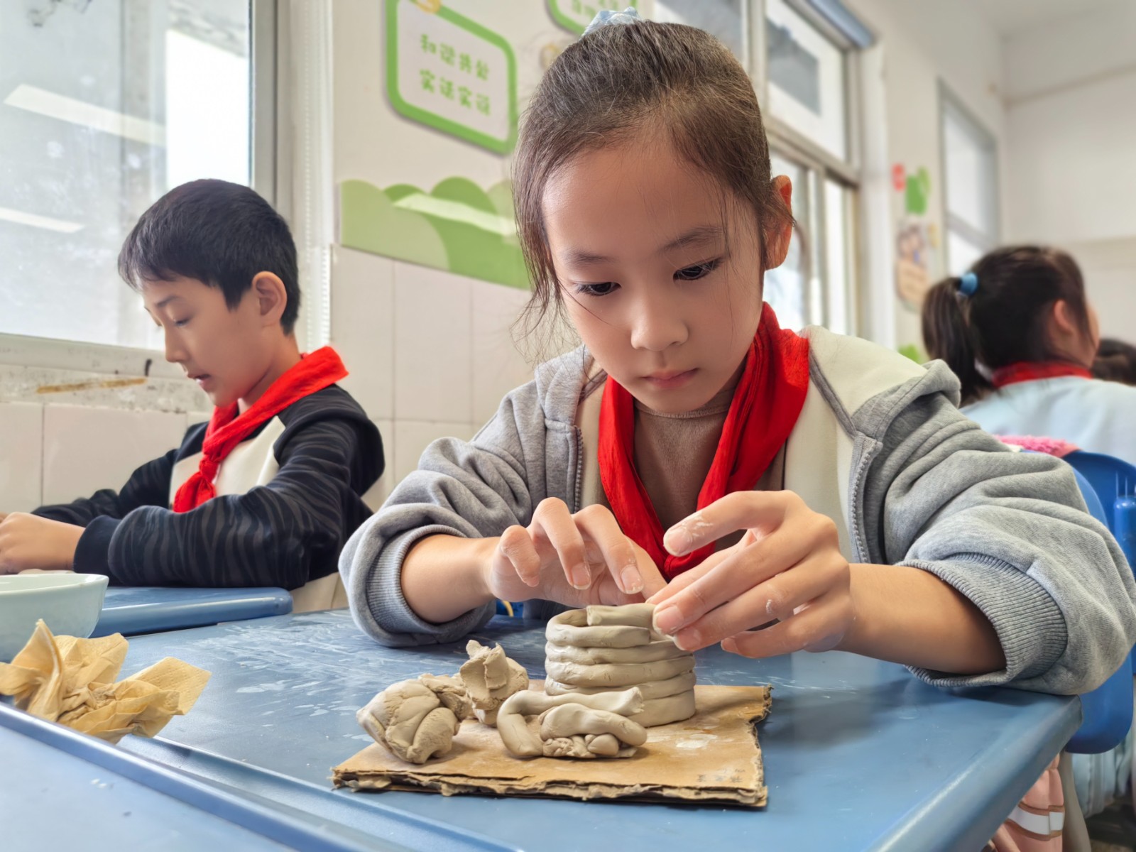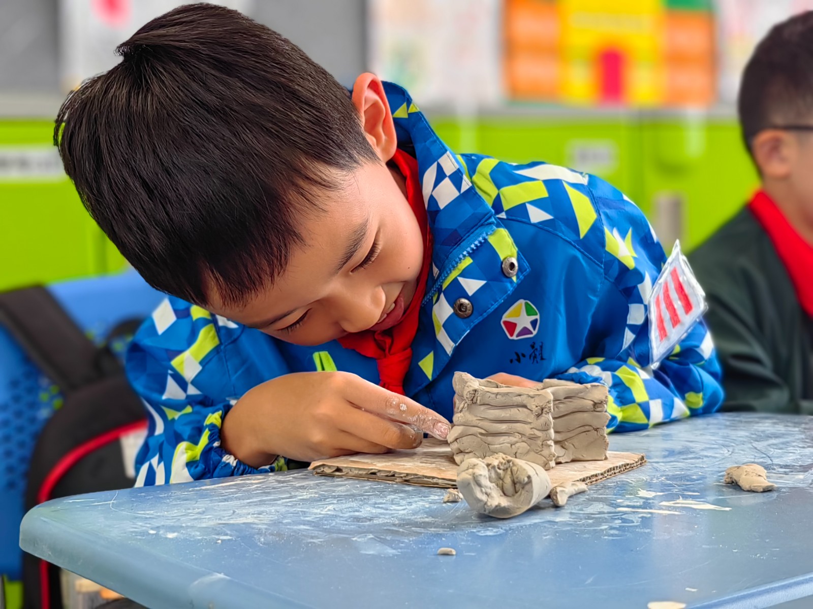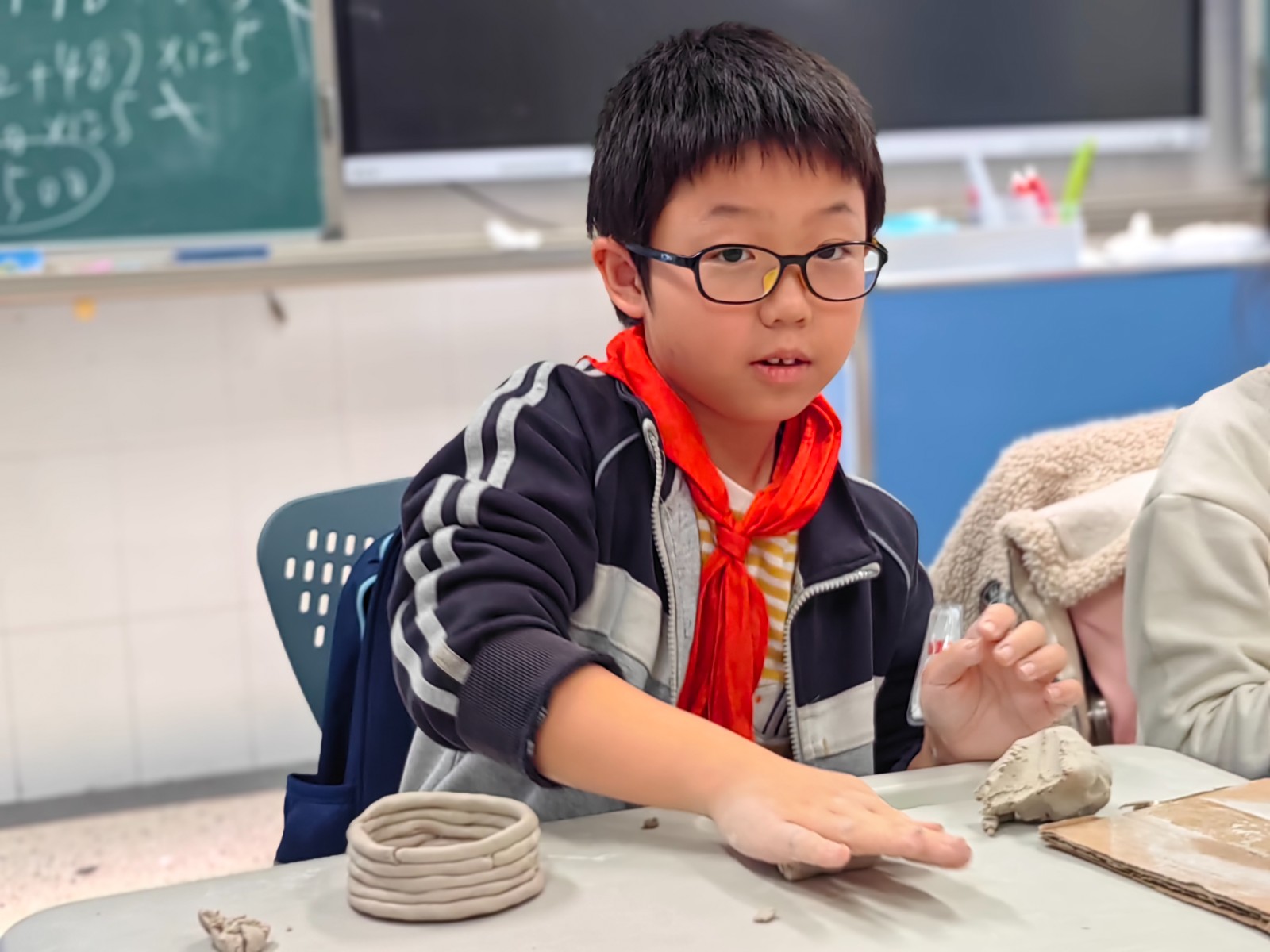户外研学活动结束后,队员们重返课堂,亲身体验泥塑陶杯的制作过程。首先由专业老师向大家讲解并演示陶杯的制作方法。随后,学生们纷纷化身“小小陶匠”,在老师的指导下用陶泥亲手制作属于自己的陶杯。揉泥、塑形、装饰……每一道工序都凝聚着孩子们的专注与智慧。一块块朴素的陶泥,在一双双巧手下逐渐变成了一个个独具特色、充满童趣的陶杯坯体。