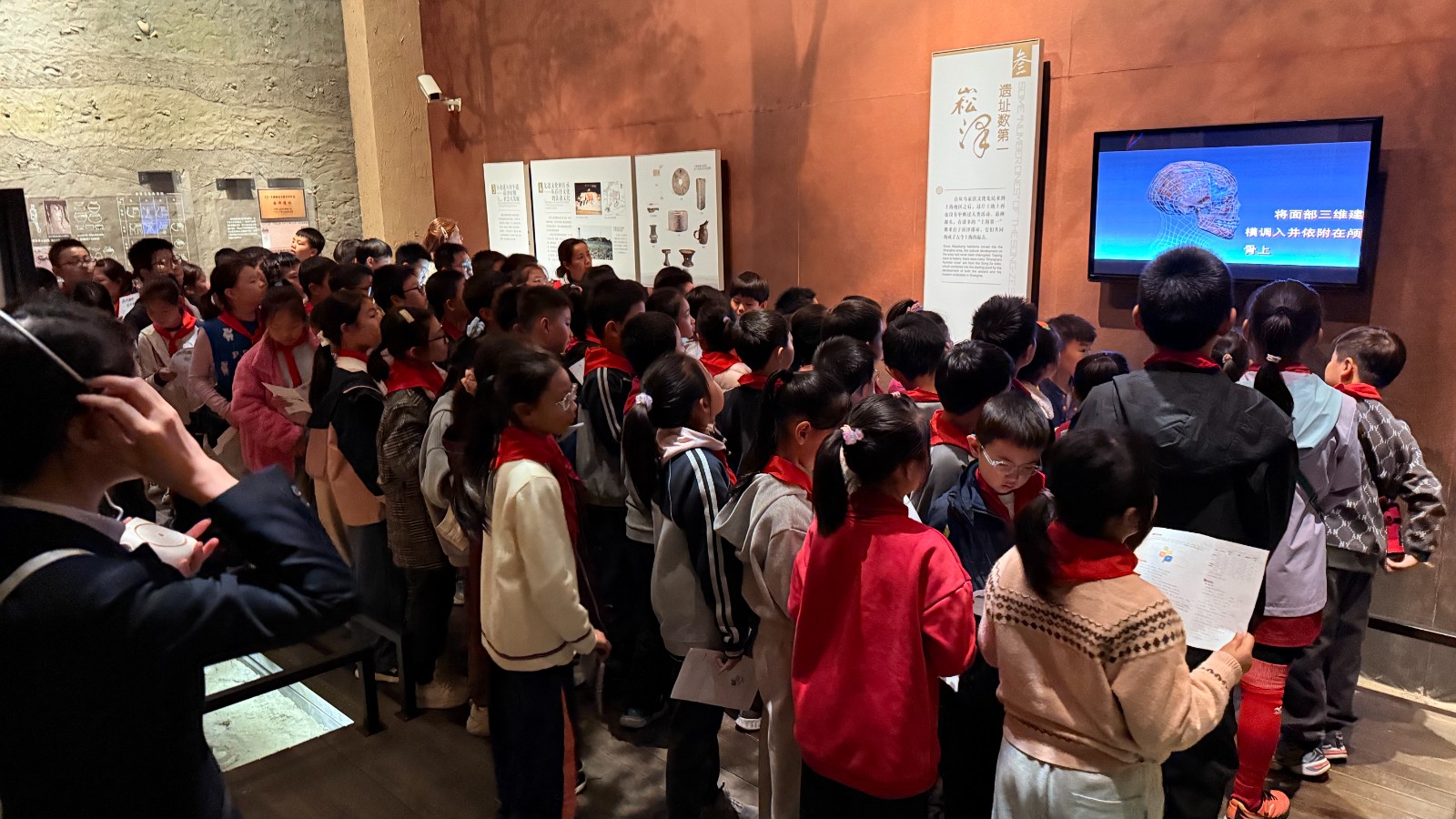 一至四班队员前往福泉山遗址,在讲解员的引导下亲眼目睹了层层叠压的文化遗迹,直观感受了从马家浜文化到良渚文化的文明演进。五至九班队员则探访了崧泽遗址博物馆,透过“上海第一人”等珍贵文物,系统了解了上海先民们从狩猎采集到定居农耕的伟大跨越。两支队伍齐头并进,共同探寻上海远古文明的来源,深化了学生们对上海史前文明的认知。