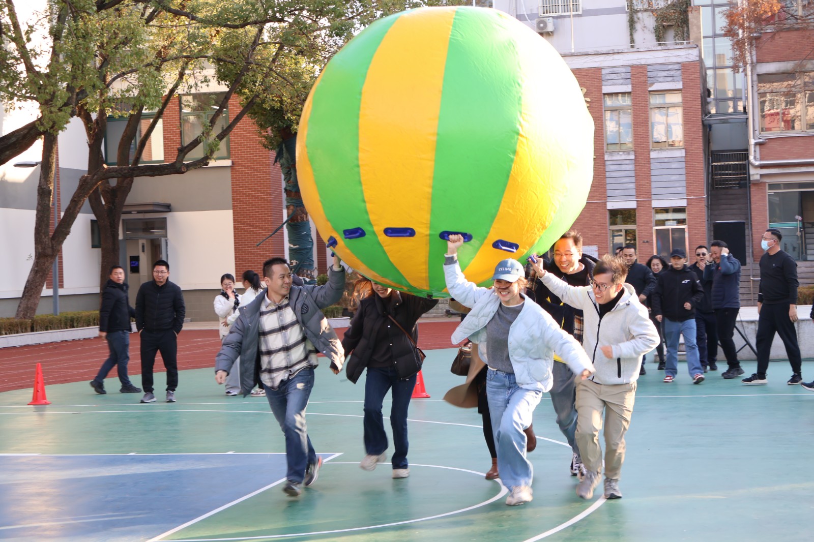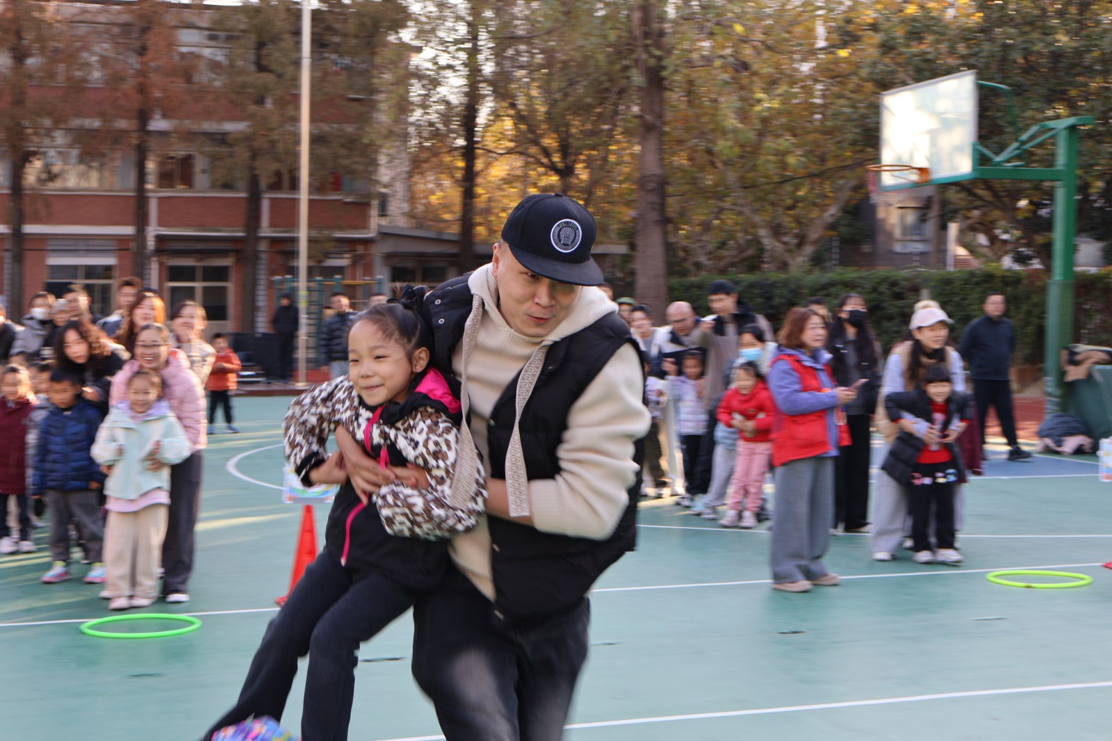 热身操点燃全场,操场瞬间沸腾。随后,“亲子接力滚滚乐”“协力团队送云梯”“亲子接力夹沙包”等趣味竞技轮番上演。孩子脚夹沙包、家长抱娃冲刺;亲子协作滚球接力;八组家庭齐心协力搭建“人形云梯”……加油声、欢呼声此起彼伏,幸福在奔跑中传递。