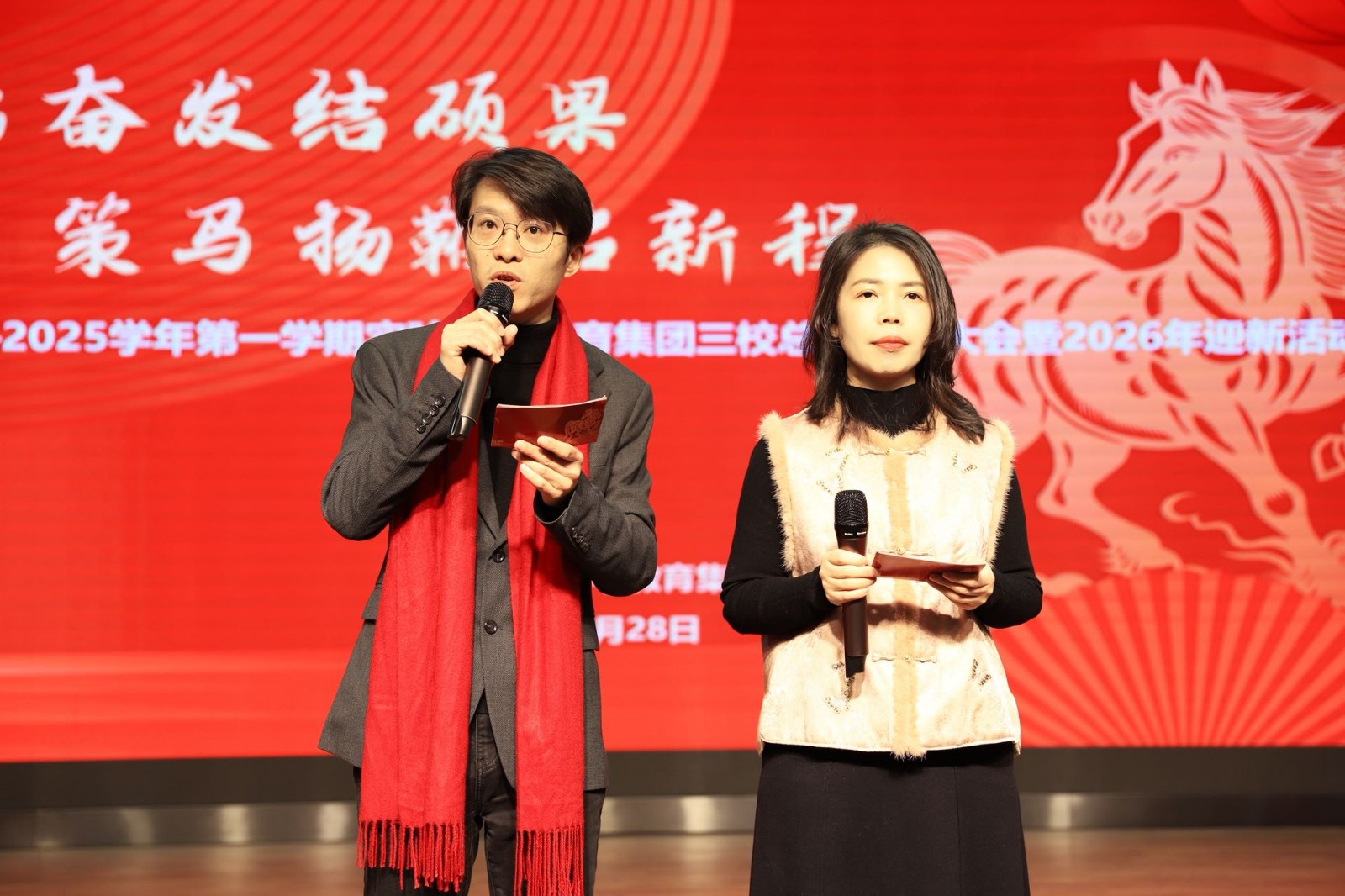 新元肇启,华章日新。为总结过往耕耘成果,表彰先进树立榜样,规划未来发展蓝图,共迎2026甲辰新春,实验小学教育集团三校齐聚豫英小学多功能厅,隆重举行2025学年第一学期总结表彰大会暨2026年迎新活动,全体教职工共赴这场满载收获与希望的盛会。活动由御澜湾学校副书记沈红丽、豫英小学副书记蒋丰呈主持。