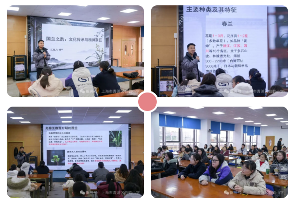 在学院专业教师杨平的引领下,教师们首先步入了“国兰的世界”。从先秦时期的文化典故,到唐宋时期艺兰理论的奠基;从“香、清、正、雅、静、和”六字文化精髓,到“一干一花为兰,一干多花为蕙”的品鉴智慧,大家逐渐感悟到国兰的文化寓意。活动现场展示了春兰、蕙兰、建兰、寒兰、墨兰、莲瓣兰等六大类国兰的实物与图谱,结合其花期、产地与形态特征,老师们不仅学会了辨认,更感受到了兰花“不以无人而不芳”的君子品格。