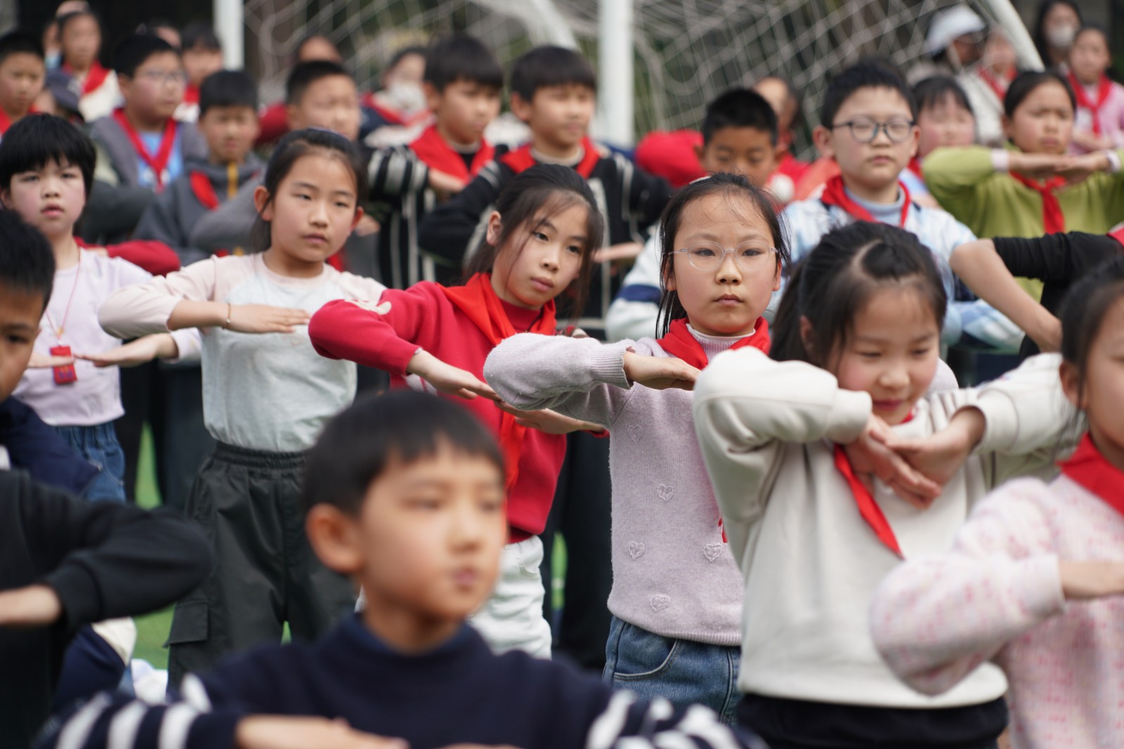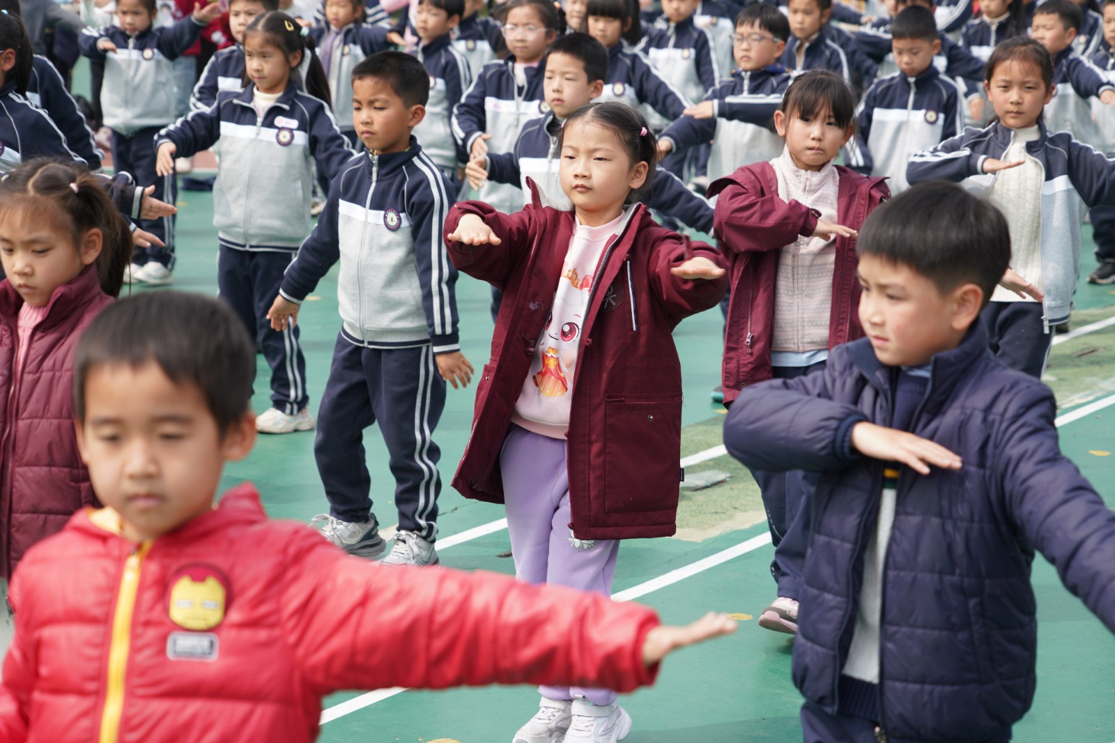 从一年级的懵懂稚嫩到五年级的沉稳干练,各年级组依次登场展示。伸展、弯腰、踢腿、摆臂,同学们动作规范标准,手臂伸直、五指并拢,每一个节拍都精准踩点,每一个动作都整齐划一。整齐的队列、饱满的精神、有力的动作,不仅展现了豫英学子朝气蓬勃的精神风貌,更凝聚着班级的团结与默契。