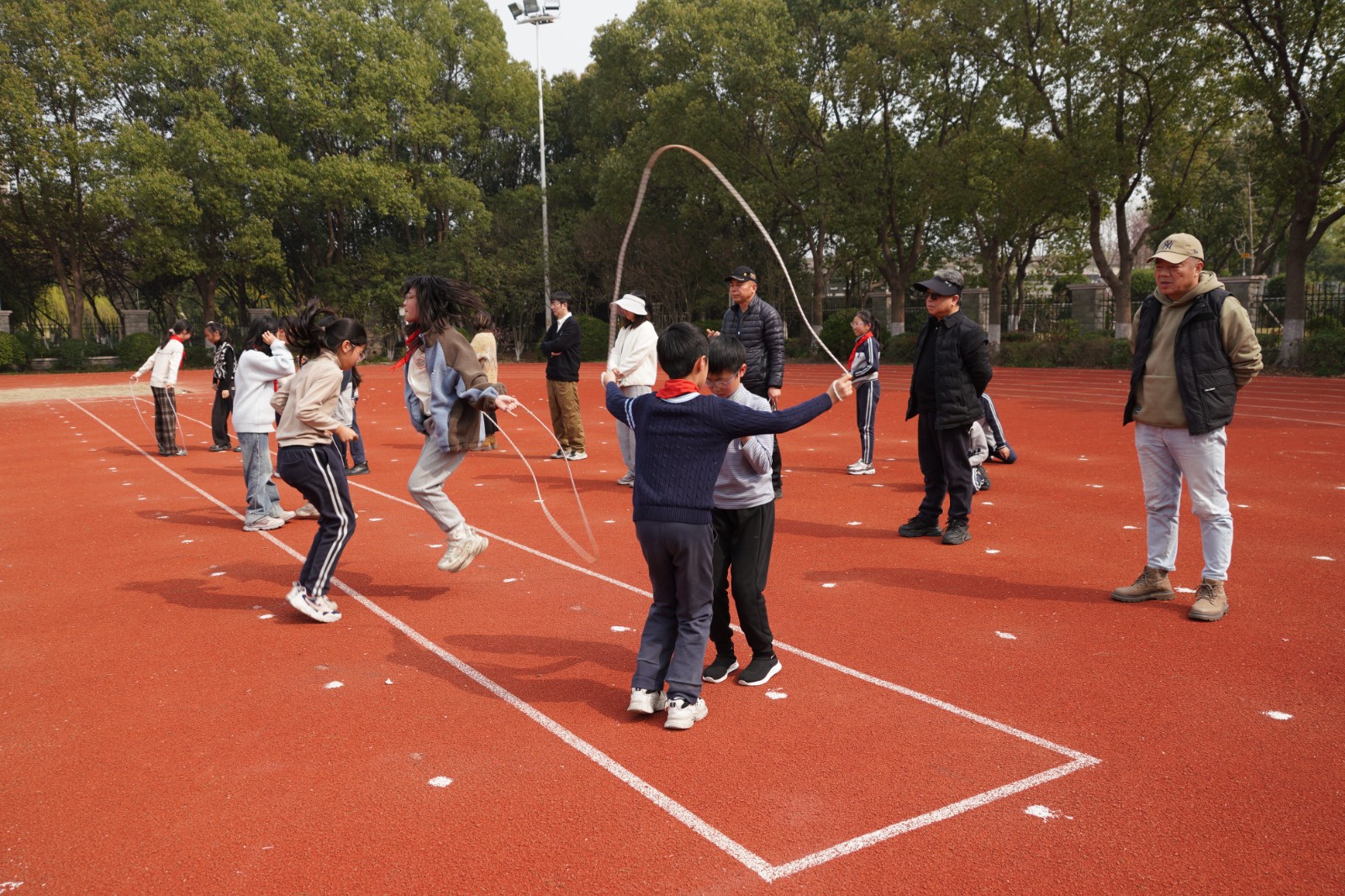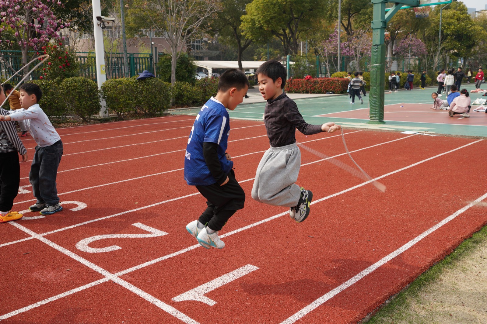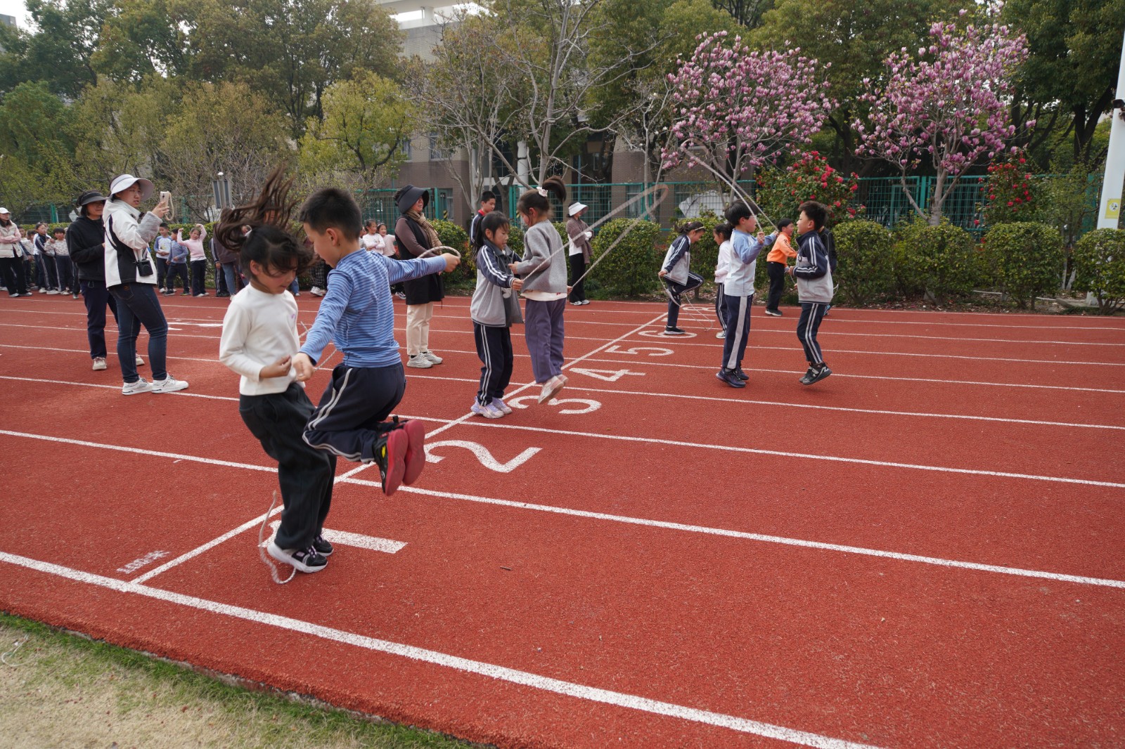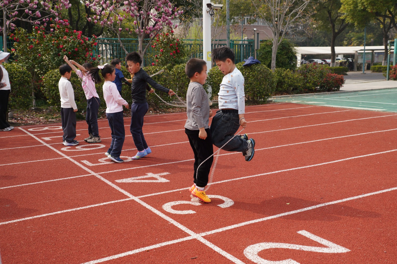 二年级&五年级·双人短绳:跑道西侧,绳影翻飞、脚步轻盈。两人一组,或前后相依,或左右并肩,手中的短绳随着节奏快速甩动,“呼呼”的绳声与同学们的计数声、呐喊声交织在一起,成了校园里最动听的动感旋律。一分钟的时间里,他们默契配合、奋力跳跃,不断挑战自我、突破极限,用协作诠释着体育的魅力。