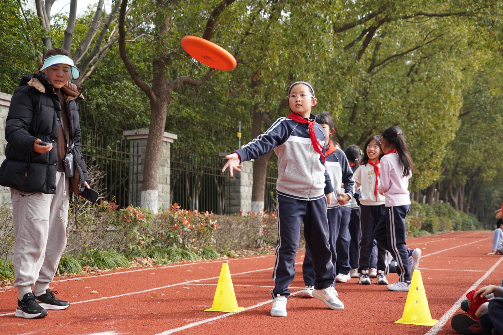 三年级·飞盘传接:跑道东侧,橙色飞盘成为传递快乐与勇气的信使。同学们分列两端、面对面站立,眼神紧紧锁定飞盘,精准传接、默契配合。即便飞盘偶尔落地,大家也毫不气馁,迅速捡起、重新出发,那份执着与坚持,赢得了场边师生的阵阵掌声。