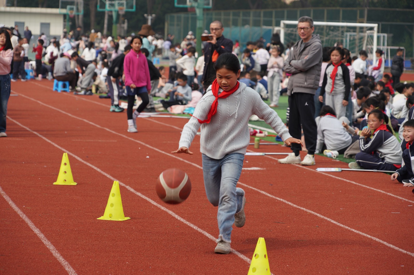 四年级·篮球运球接力:司令台旁,篮球运球接力赛更是扣人心弦!小选手们手持篮球,化身灵巧的小燕子,S形灵活绕过标志桶,在呼啦圈内稳稳原地拍球五次后,飞速直线返回。篮球撞击地面的“砰砰”声,与孩子们的心跳同频共振;每一次交接棒,都考验着速度与默契,现场加油声、欢呼声不断,将活动气氛推向高潮。