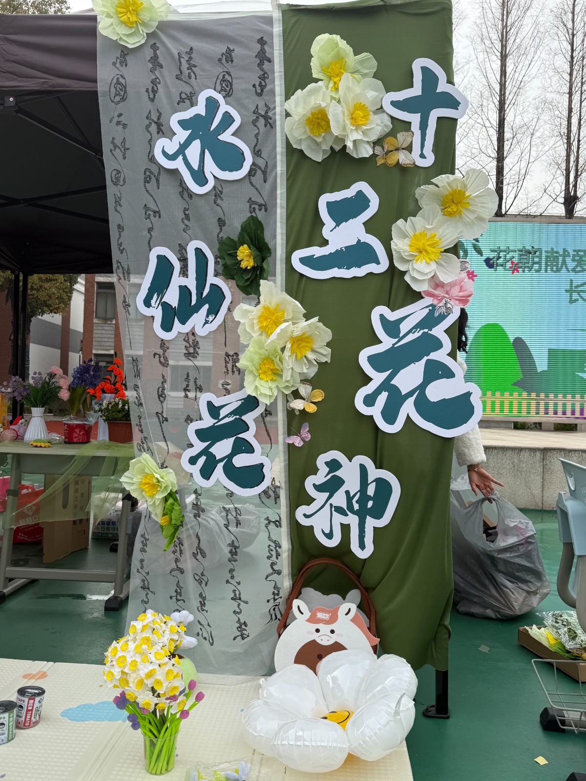 3月25日上午,爱心义卖活动在学校操场如期拉开帷幕。早在上午第一节课,各中队队员就与家长志愿者们一同忙碌起来,为花朝市集的摊位布置全力以赴。本次义卖以“十二花神”为创意核心,每个中队选定一位专属花神作为摊位主题——从一月傲雪的梅、二月温婉的杏、三月灼灼的桃,到四月华贵的牡丹、五月似火的榴、六月清雅的荷……直至十二月凌波的水仙,十二花神主题摊位各展风姿,将操场幻化为一片充满诗意与童趣的花朝市集。