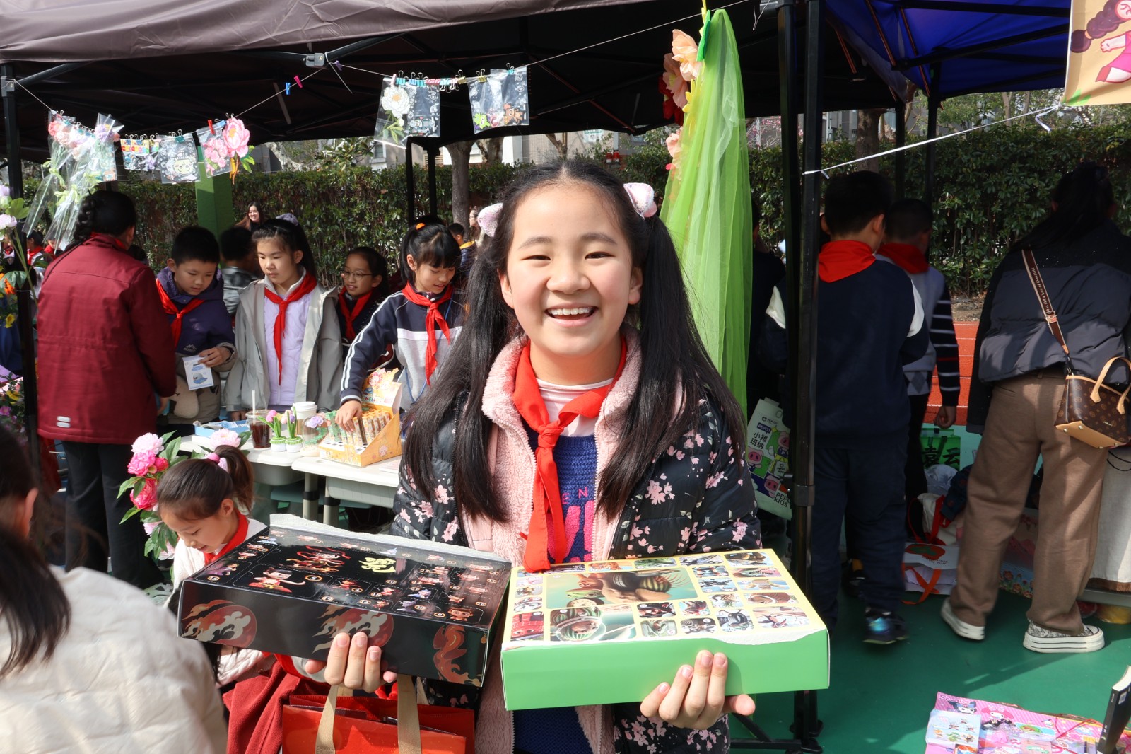 流动的爱心小推车也循着市集脉络穿梭于校园,小背包里装满了各中队的花神主题好物,小队员们自豪地说:“我的背包里都是花神小美好,要把温暖送到校园每一角。”本次义卖的最大亮点,当属各中队围绕花神主题亲手制作的各类手工艺品:梅花神主题的木质钥匙圈、桃花神主题的粉黛发卡、荷花神主题的莲韵手链、桂花神主题的金桂项链,还有各式花神造型的装饰品、文创小物等。每一件手作都饱含孩子们的心意,既藏着花朝的雅致,又承载着分享的善意,让孩子们在挑选好物的同时,既能收获趣味,又能传递温暖。瞧,各花神摊位上一个个忙碌的身影,一张张洋溢着笑容的脸庞,热烈而温馨,让美好童年在花朝献爱的氛围里熠熠生辉。