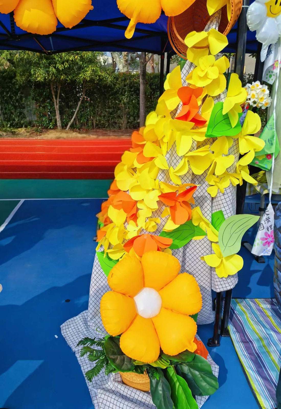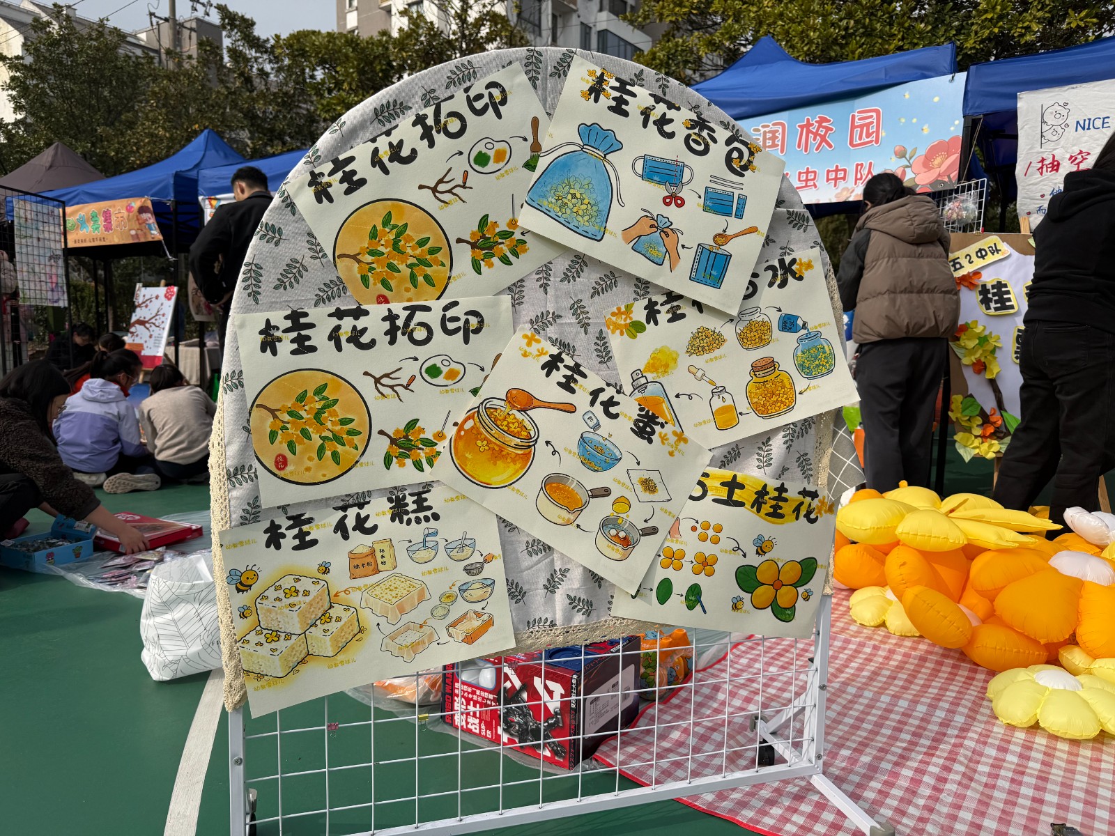 各中队围绕选定的花神主题巧思布局、精心陈列物品:梅花神摊位将手作好物错落悬挂,宛若寒梅枝头绽蕊;桃花神摊位把精美摆件分色摆放,恰似桃花缤纷盛放;荷花神摊位以粉绿配色搭配纱幔、仿真荷莲与荷叶灯笼,营造出清雅的荷塘景致;桂花神摊位用金桂色绸带、仿真桂枝搭配香薰瓶,满溢清甜桂香;水仙神摊位以淡蓝莹白纱幔搭配仿真水仙,勾勒出凌波仙子般的素雅意境。队员们绞尽脑汁妆点摊位,让每一个花神摊位都独具韵味、引人注目。各摊位制作的精美花神主题海报更是精彩纷呈,梅花的清雅、杏花的温婉、荷花的高洁跃然纸上,花神传说与春日美好相融,成为市集里一道别样的风景线。