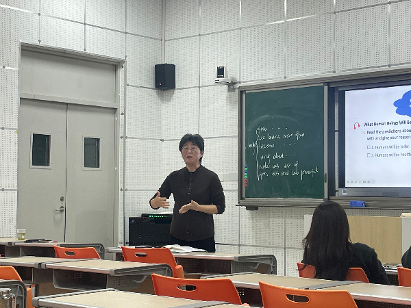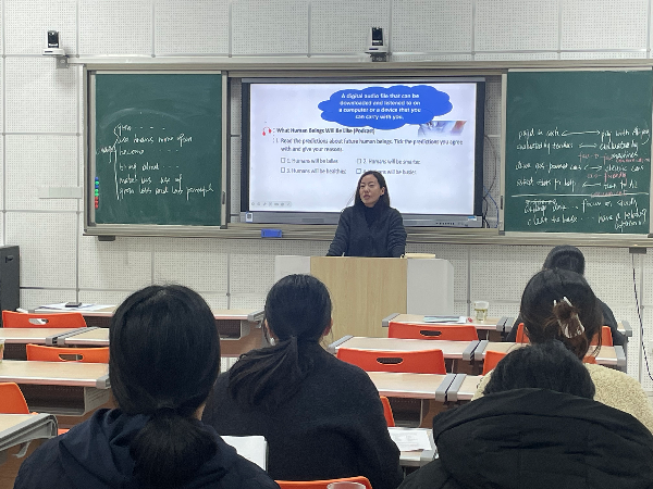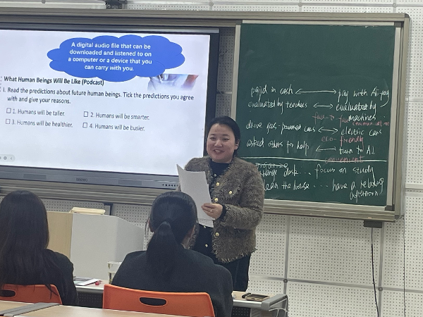 第二节是秦莉老师的听说课《What Humans Will Be Like》,对应上外版选择性必修一 Unit4。秦老师通过播客音频引导学生预测未来人类变化,围绕核心问题展开口语输出,借助平板电脑助力学生自主听力、小组讨论与观点上传,为个性化学习和协作提供支持。