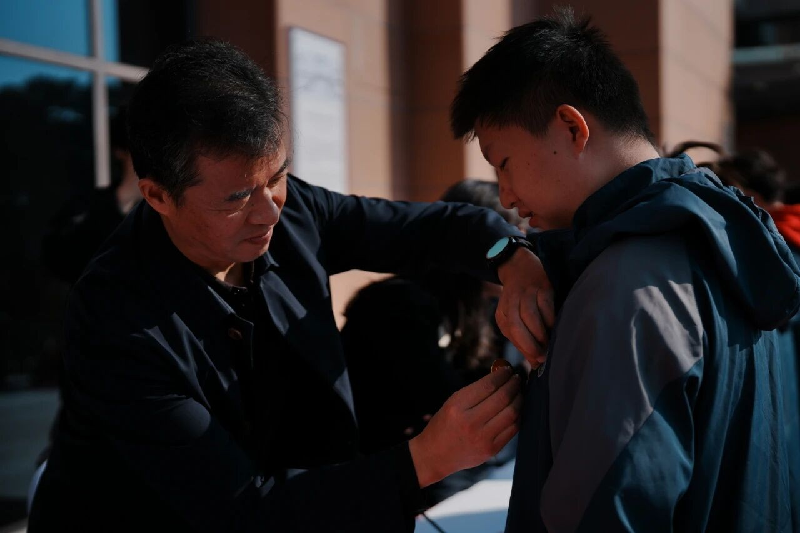 在悠扬的《青春纪念册》旋律中,学校领导为各班学生代表佩戴成人纪念徽章,同学们也互相佩戴。这枚小小的徽章,不仅象征着年岁的增长,更代表着公民责任的全新开始。随后,在团支部书记张伶智老师的带领下,全体学生面向国旗,高举右拳,庄严宣誓:"为了昨天的纯真,为了今天的责任,为了明天的理想......"铿锵誓言,回荡在沙家浜的上空,也铭刻在每个学子的心底。