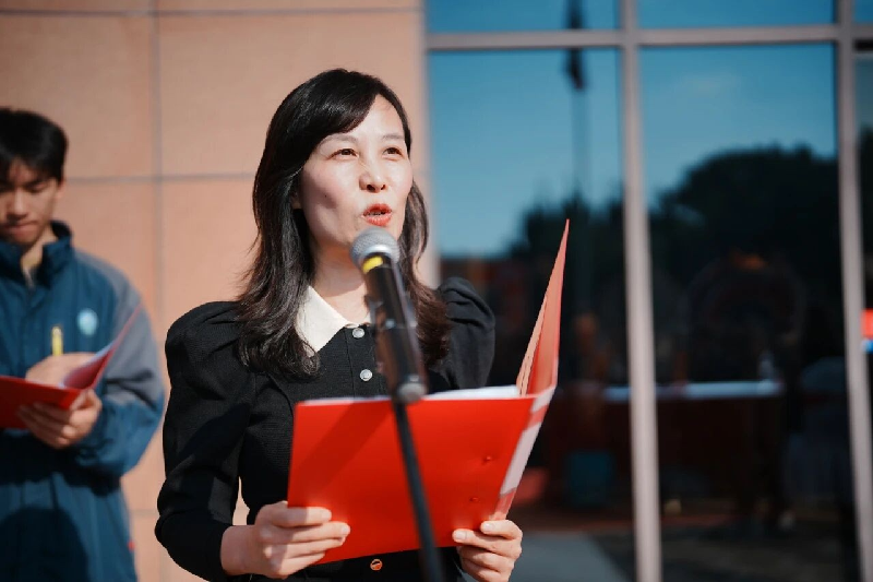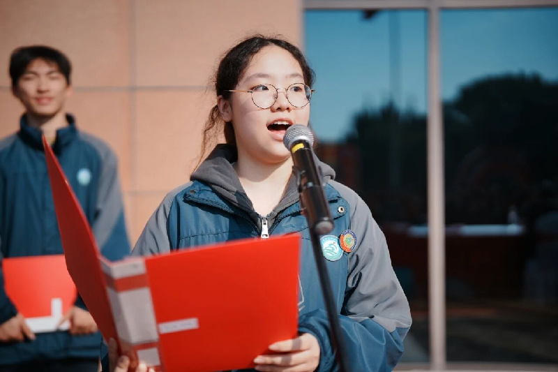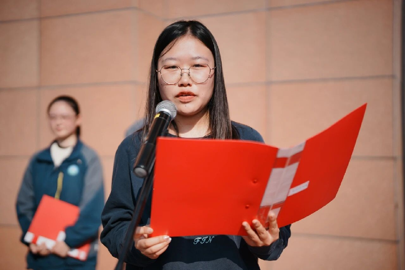 学生代表夏予衡同学从"烽火青春"的历史回望出发,带领大家思考八十年前的同龄人如何在战火中淬炼青春。"他们的青春,被时代的烽火点燃,不是为了照亮自己前行的路,而是为了焚尽世间的黑暗",她呼吁同学们要"心怀家国,砺学笃行,理性包容",在新时代的征程中接续奋斗。