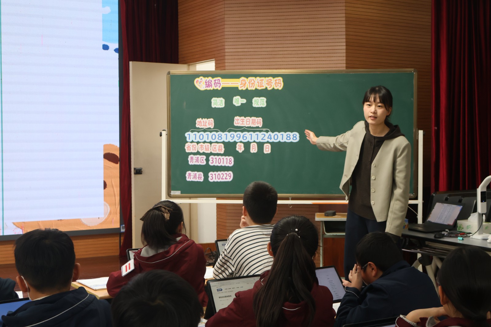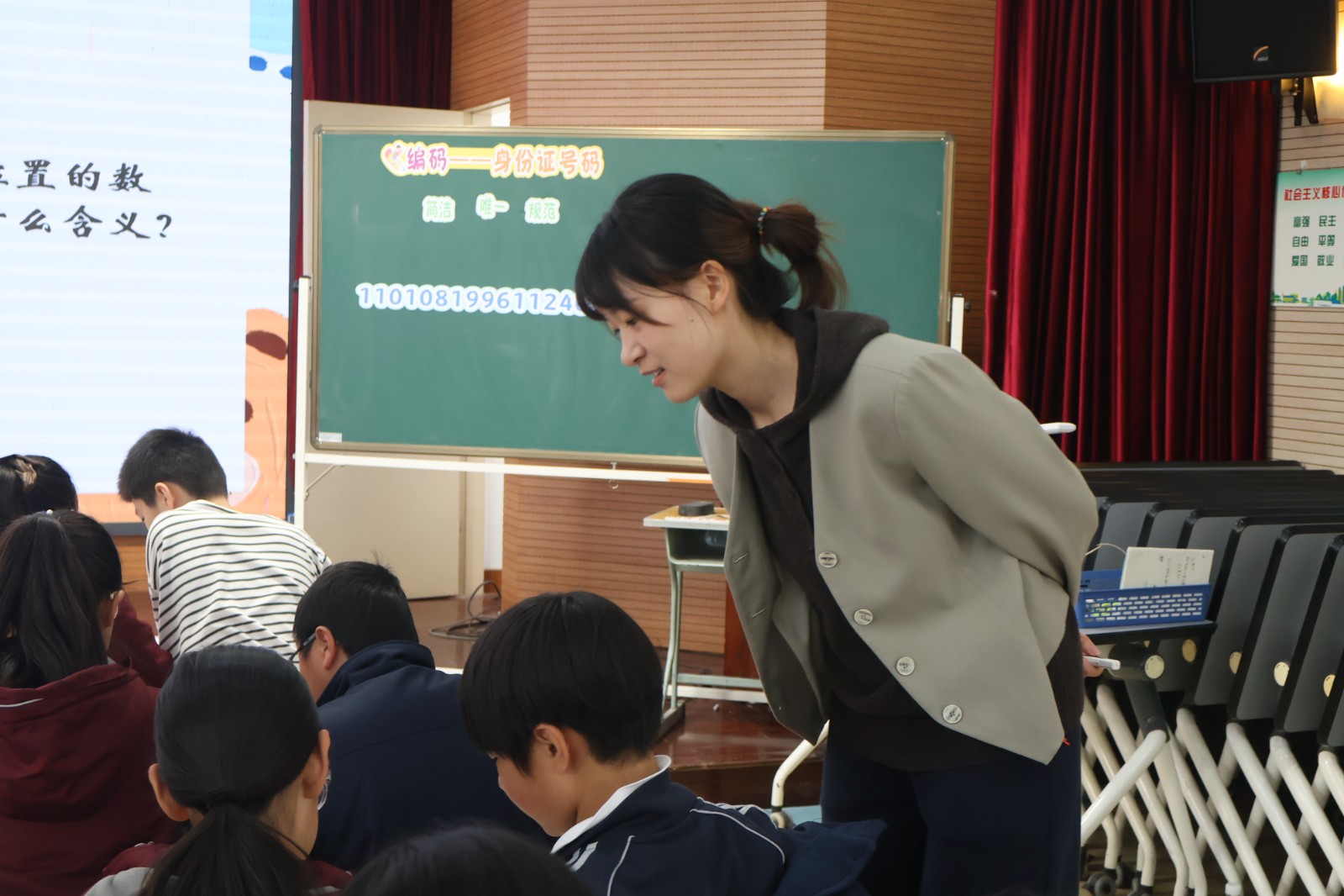 首先,实验小学王敏老师展示了五年级数学上册《编码——身份证号码》一课教学。王老师应用“三个助手”平台以及互联网搜索查询等途径方式,即时收集与分析学情数据,及时提供学习支持;让学生在观察、猜测、讨论、体验的过程中,主动构建编码知识体系;探索身份证号码中的编码规则,记忆自己的身份证号码;然后灵活运用所学,化身“学籍管理中心工作人员”,融入区域码、年份码等信息,合理设计学籍号编码规则,实现从“学会”到“会创”的能力提升。